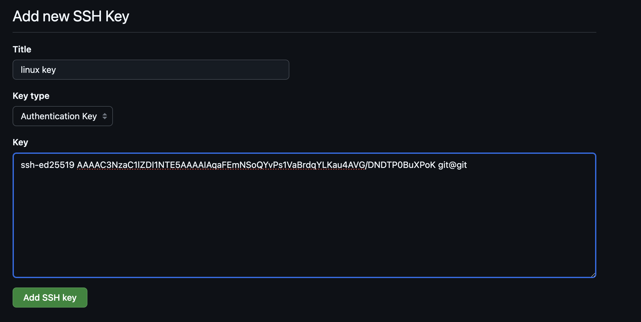 linux key), atur Key Type menjadi Authentication Key, dan masukkan ssh public key di kolom Key, kemudian klik Add SSH key.