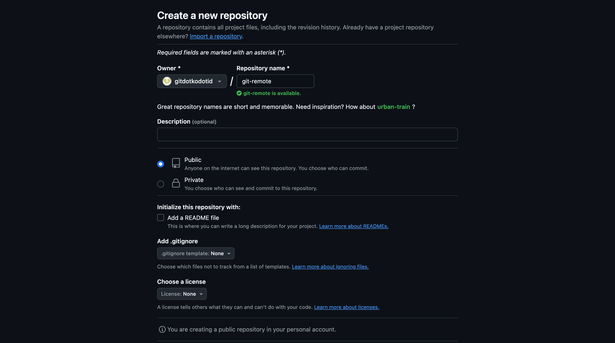 Setelah membuat repository di GitHub, kita perlu membuat remote repository di lokal agar Git bisa menghubungkan project ke repository GitHub.