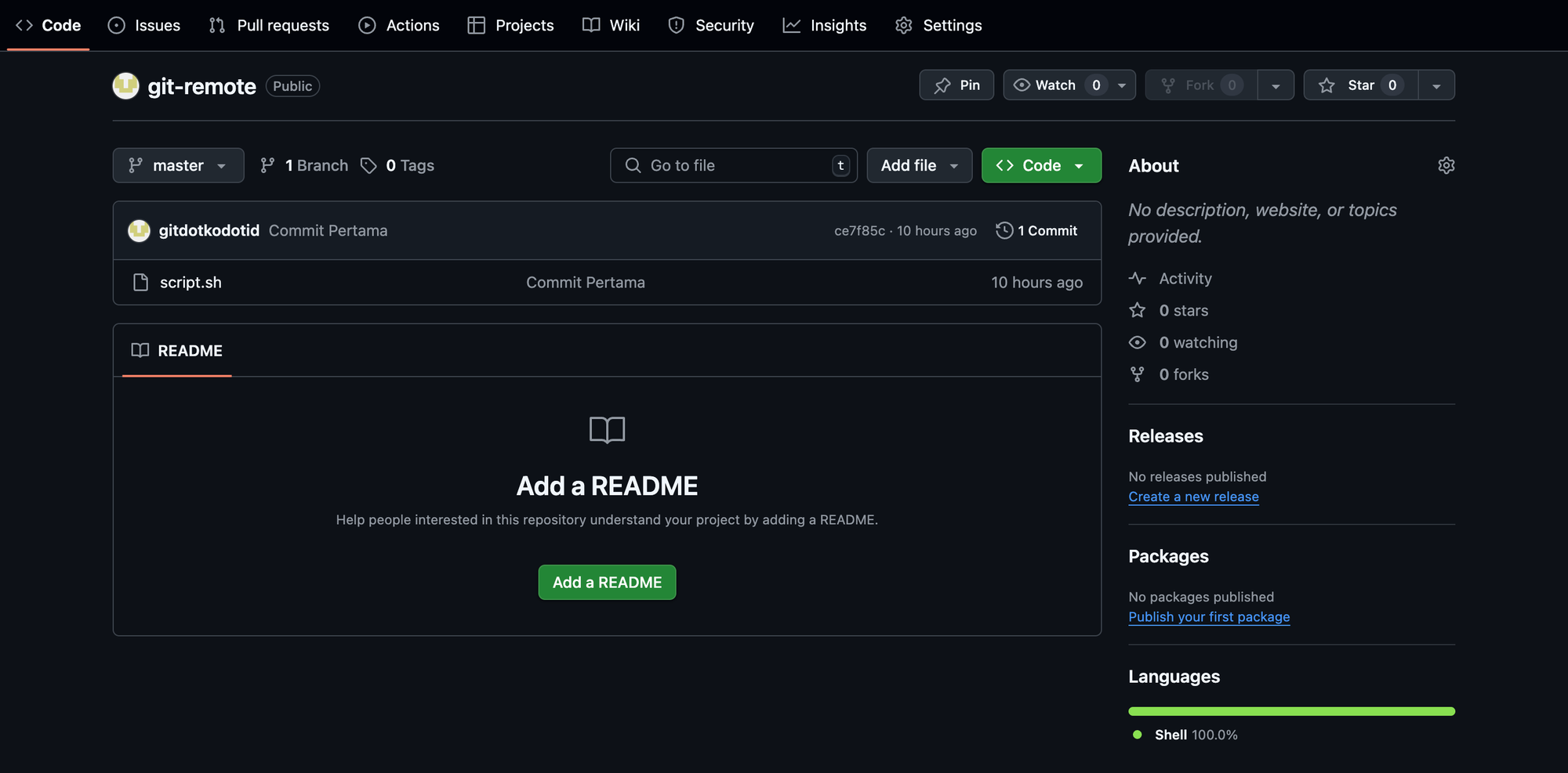 Sebagai catatan git-remote adalah nama repositorinya, jadi bisa disesuaikan kebutuhan. Folder ini nantinya berfungsi sebagai repository lokal. Untuk memulai tracking perubahan oleh Git, kita perlu menginisialisasi repository dengan perintah: